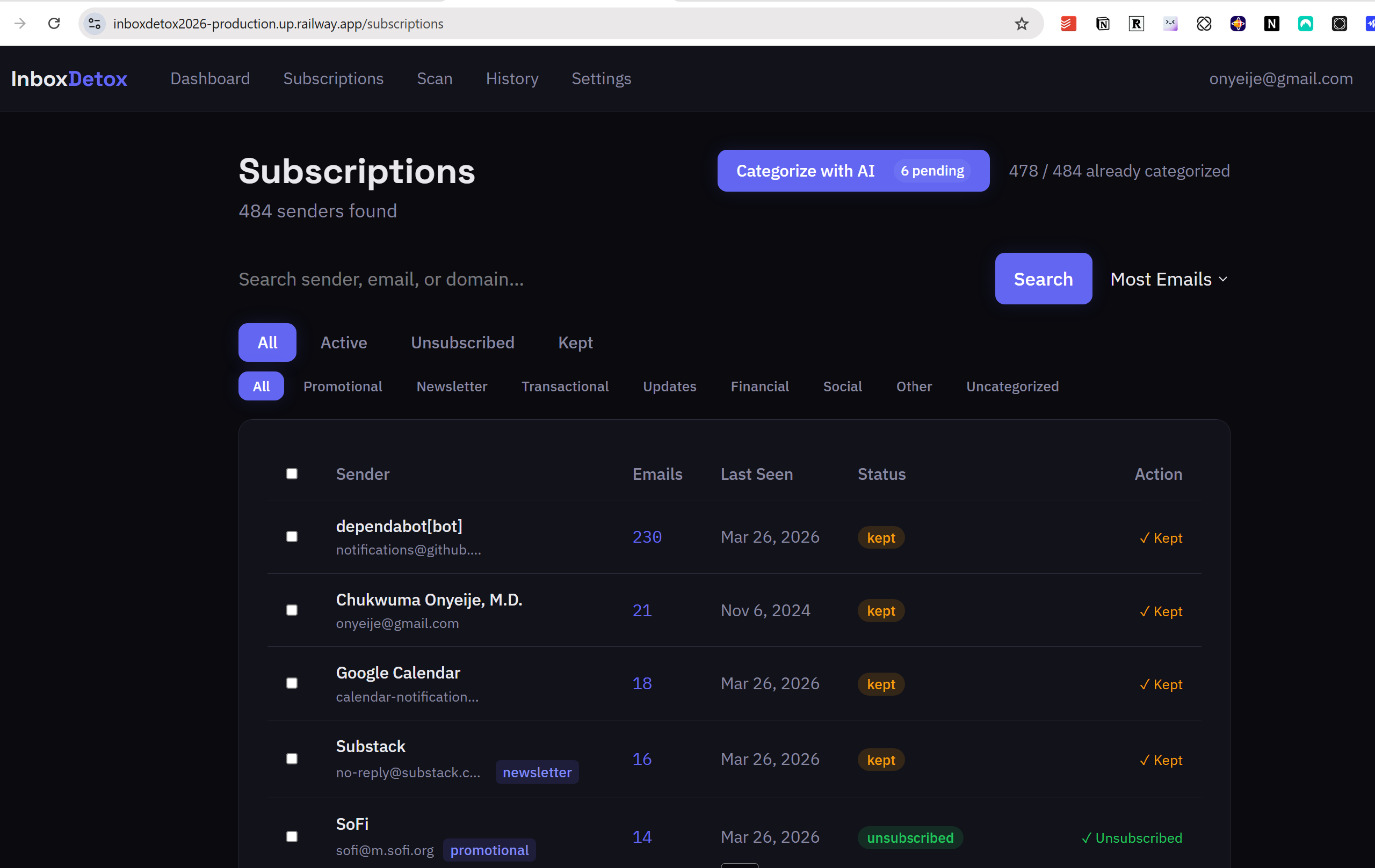 What works well: the scan itself, the dashboard, the bulk keep/unsubscribe flow, and the Railway deployment. That is enough for what this is.